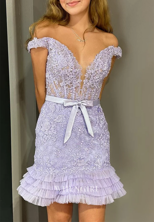 Lavender Off Shoulder V Neck Sleeveless Bowknot Sheath Ruffles Short Homecoming Dress