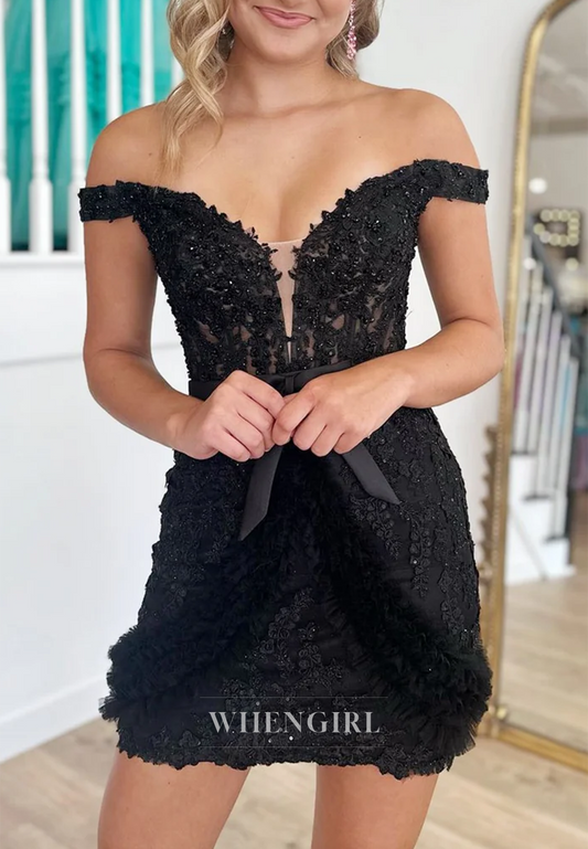 Black V Neck Off Shoulder Appliqued Lace Bowknot Sheath Short Homecoming Dress
