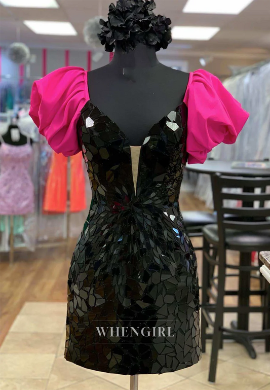Sheath V Neck Cut Glass Mirro Short Puff Sleeves Back Zipper Homecoming Dress