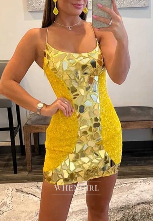 Marigold Sheath Spaghetti Straps Cut Glass Mirro Sleeveless Homecoming Dress