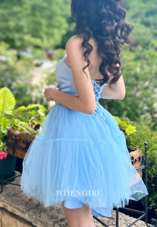 A-Line Sleeveless V Neck Multi Tiered Lace Up Short Tulle Homecoming Dress