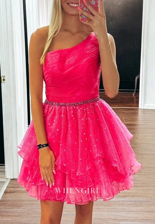 One Shoulder Pleated Beaded Asymmetrical Hem Sleeveless A-Line Homecoming Dress