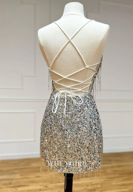 Sheath V Neck Sleeveless Tassel Cross Back Short Sequins Homecoming Dress