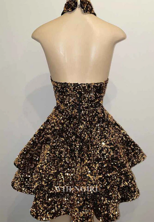 A-Line Halter Sequins Sleeveless Cut Out Ruffles Back Zipper Homecoming Dress