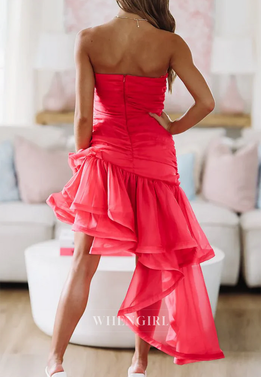 Red V Neck Sleeveless Pleated Ruffles Back Zipper Asymmetrical Hem Homecoming Dress