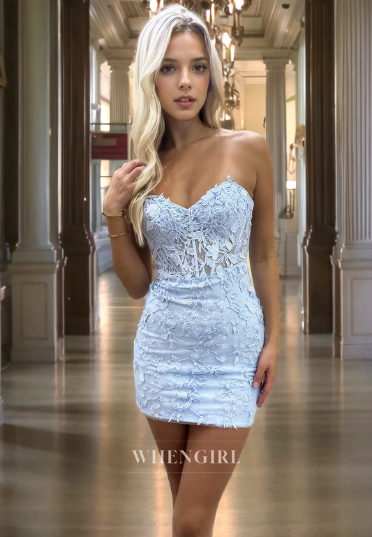 Sheath Strapless Sleeveless Lace Appliques Criss Cross Straps Homecoming Dress