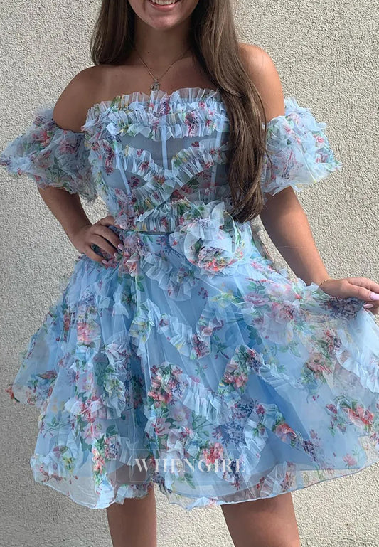Blue Printed Off the Shoulder A-Line Short Homecoming Dress with RufflesOrdinarie pris Från $145.00 USDOrdinarie prisEnhetspris / per-