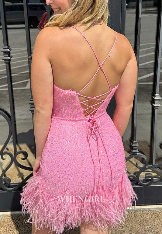 Candy Pink Spaghetti Straps Sequins Lace Up Bodycon Short Homecoming Dress with FeatherOrdinarie pris Från $148.00 USDOrdinarie prisEnhetspris / per-