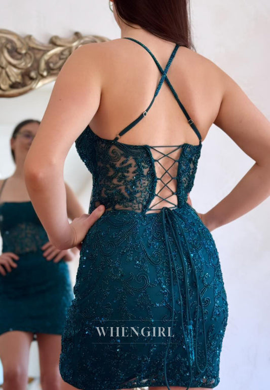 Peacock Spaghetti Straps Sleeveless Lace Up Beaded Sheath Short Homecoming DressOrdinarie pris Från $156.00 USDOrdinarie prisEnhetspris / per-