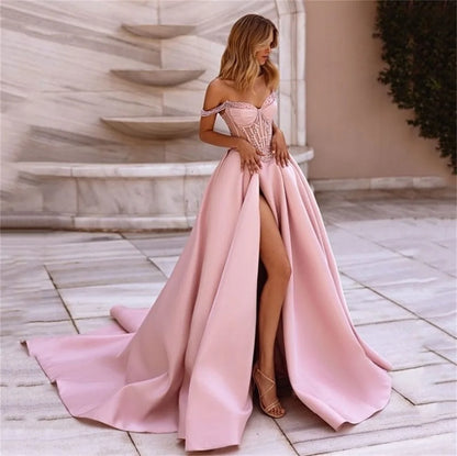 Off Shoulder With Pearls Prom Dress Side High Split A-line Court Train Evening Gown 2025