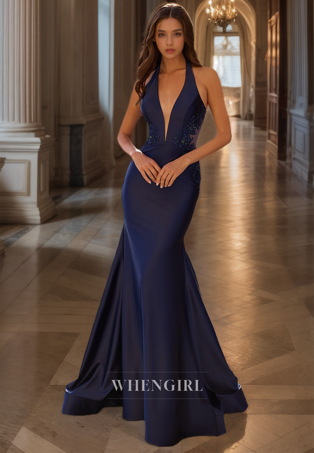 Halter V-Neck Sleeveless Sweep Train Appliques Satin Prom Dress with Beaded Formal Gowns x 1;