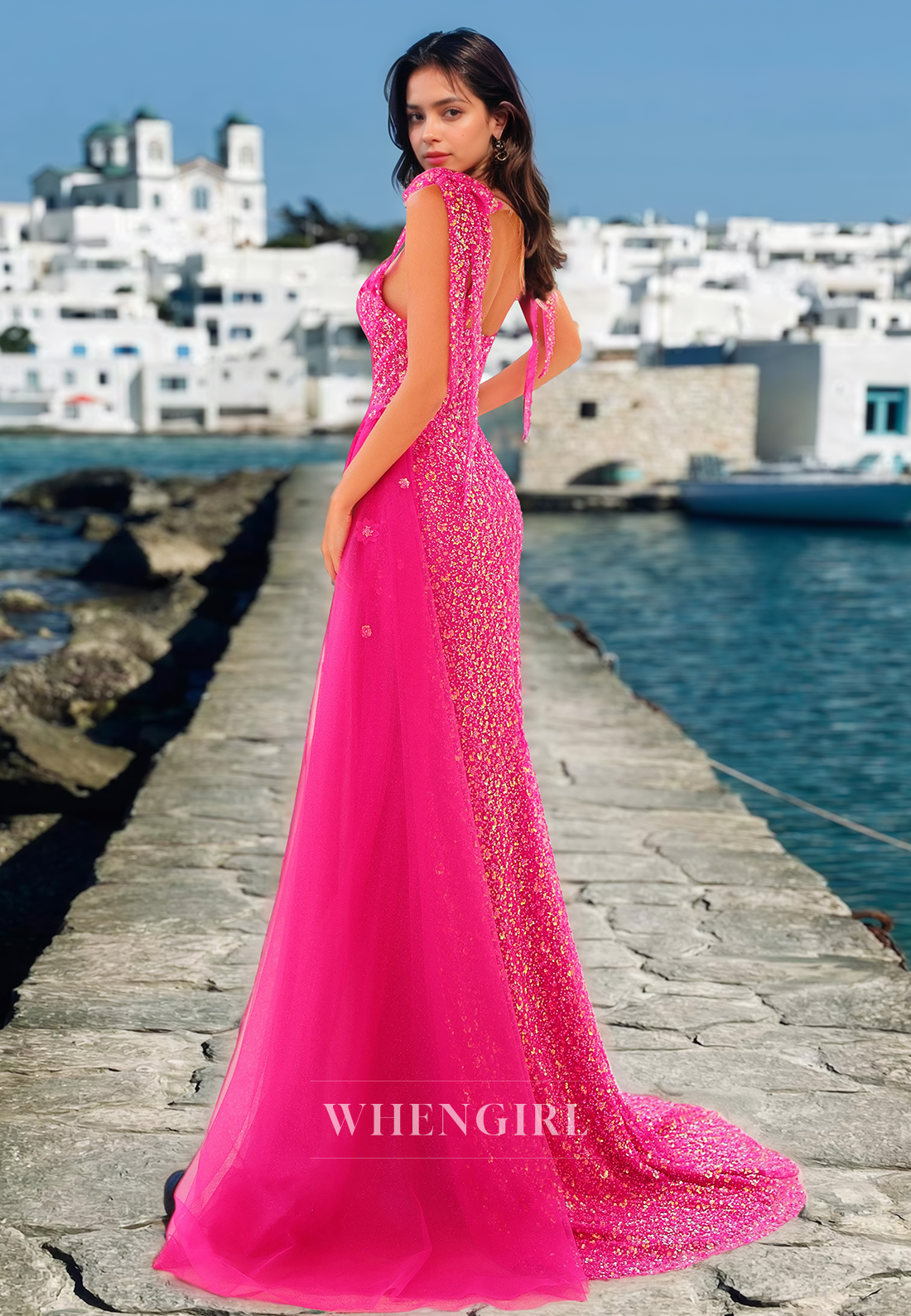 Glomaorous Sweetheart Sleeveless Stripe Train Sheath Sequins Lace Formal Prom Dress with Slit