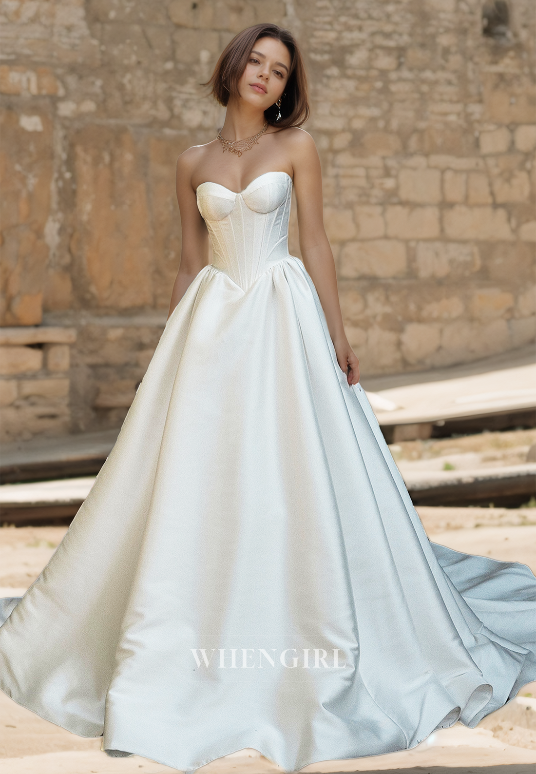 A-Line Sweetheart Sleeveless Sweep Train Stripe Satin Bridal Dress with Pleats Wedding Dress