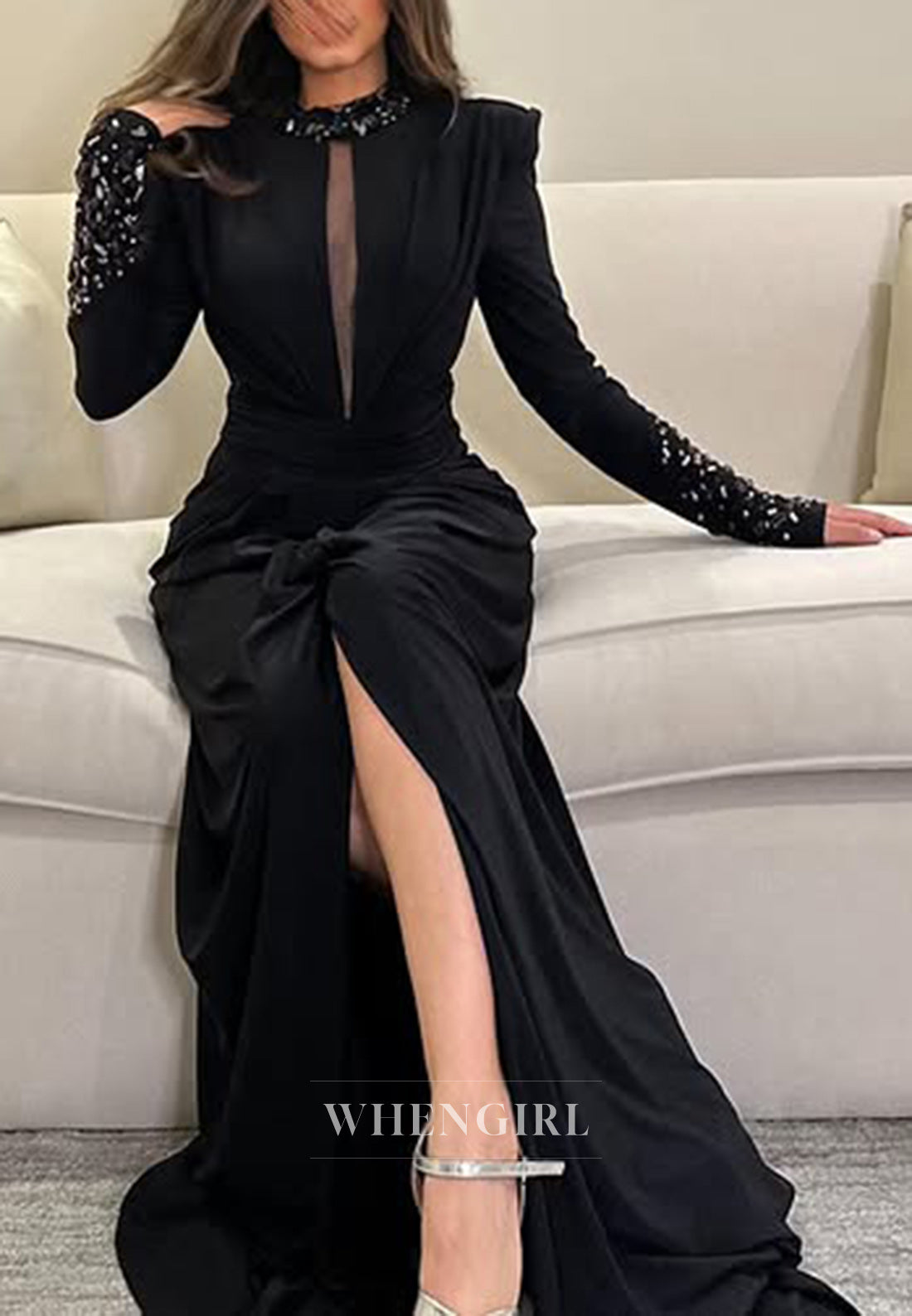 Chic High Neck Black Chiffon Beads Long Sleeves Formal Evening Dress with Slit