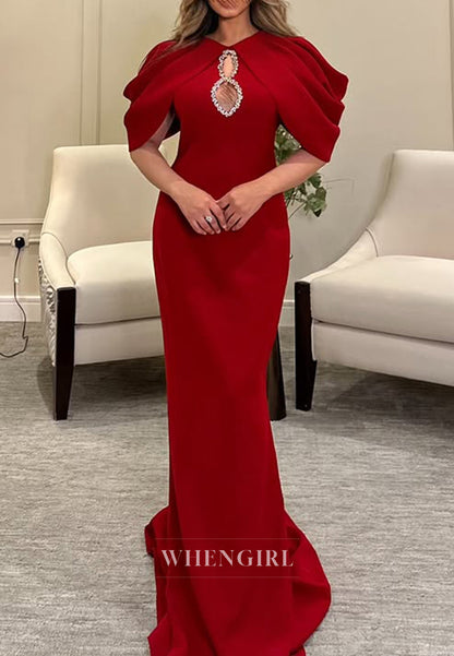 Chic High Neck Bell Sleeves Pleats Red Mermaid Formal Evening Dress