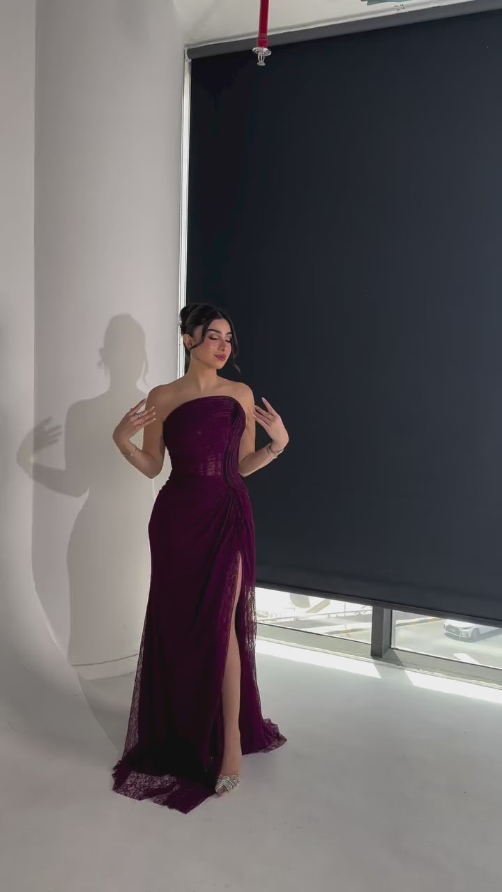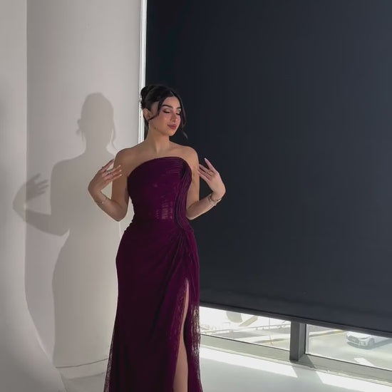 This daring grape-colored sheath dress features a strapless, sleeveless silhouette with elegant pleating that enhances its form. A lace-up back adds an edgy, customizable fit, while the side slit offers a bold touch of movement—perfect for making a striking impression at any formal evening event.