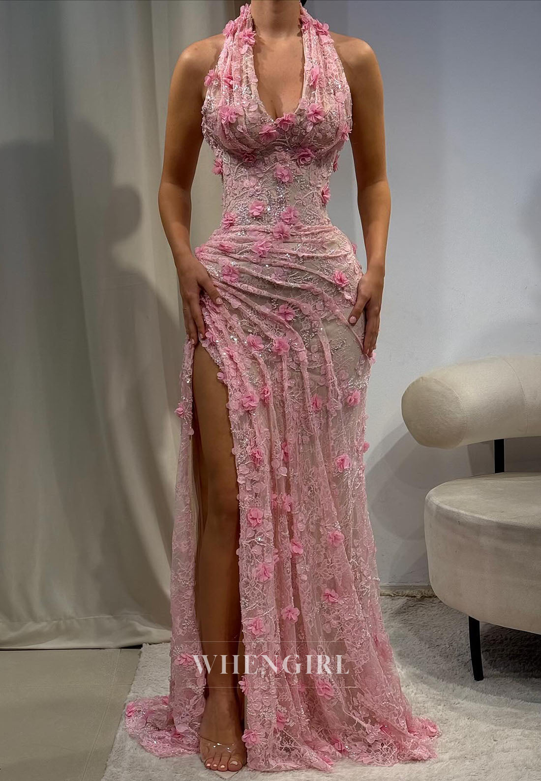Turn heads at your next special event in this stunning sheath gown that's equal parts elegance and edge. The halter neckline frames your shoulders beautifully while delicate floral details add romantic flair. Sleek and form-fitting through the bodice, the ruched detailing creates gorgeous dimension, and that daring side slit? Pure showstopper energy. Perfect for prom, galas, or any night you want to feel absolutely fabulous. This dress doesn't whisper—it commands attention.