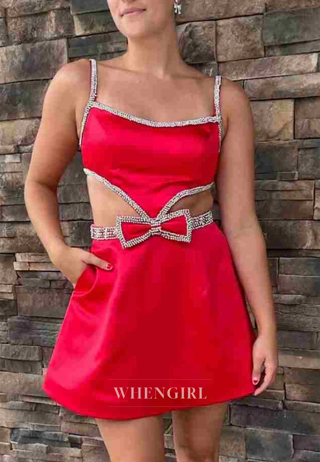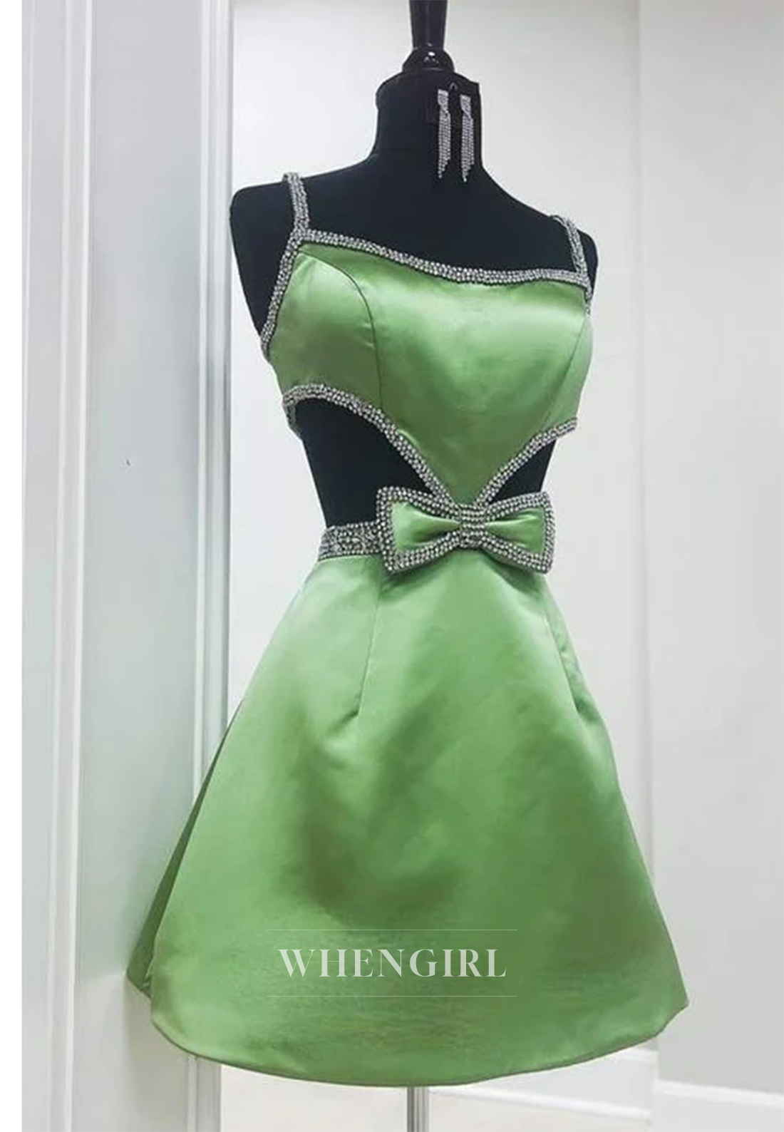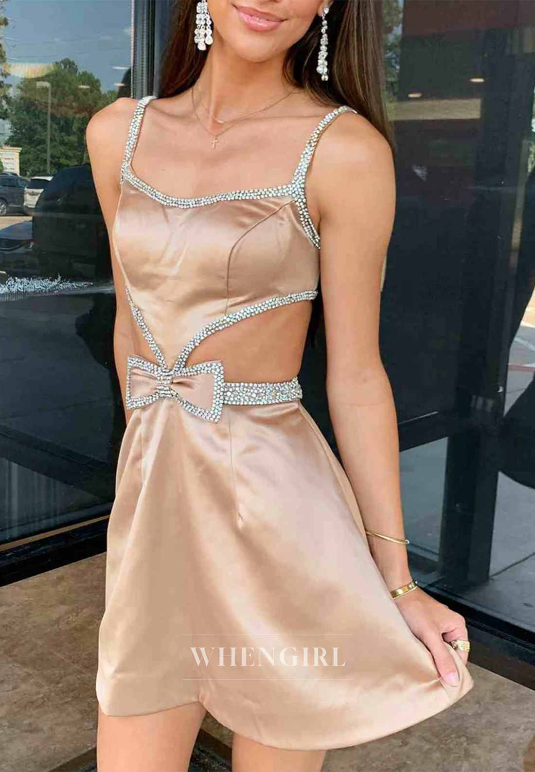 A-Line Cut Out Sleeveless Square Neck Beaded Bowknot Satin Homecoming Dress