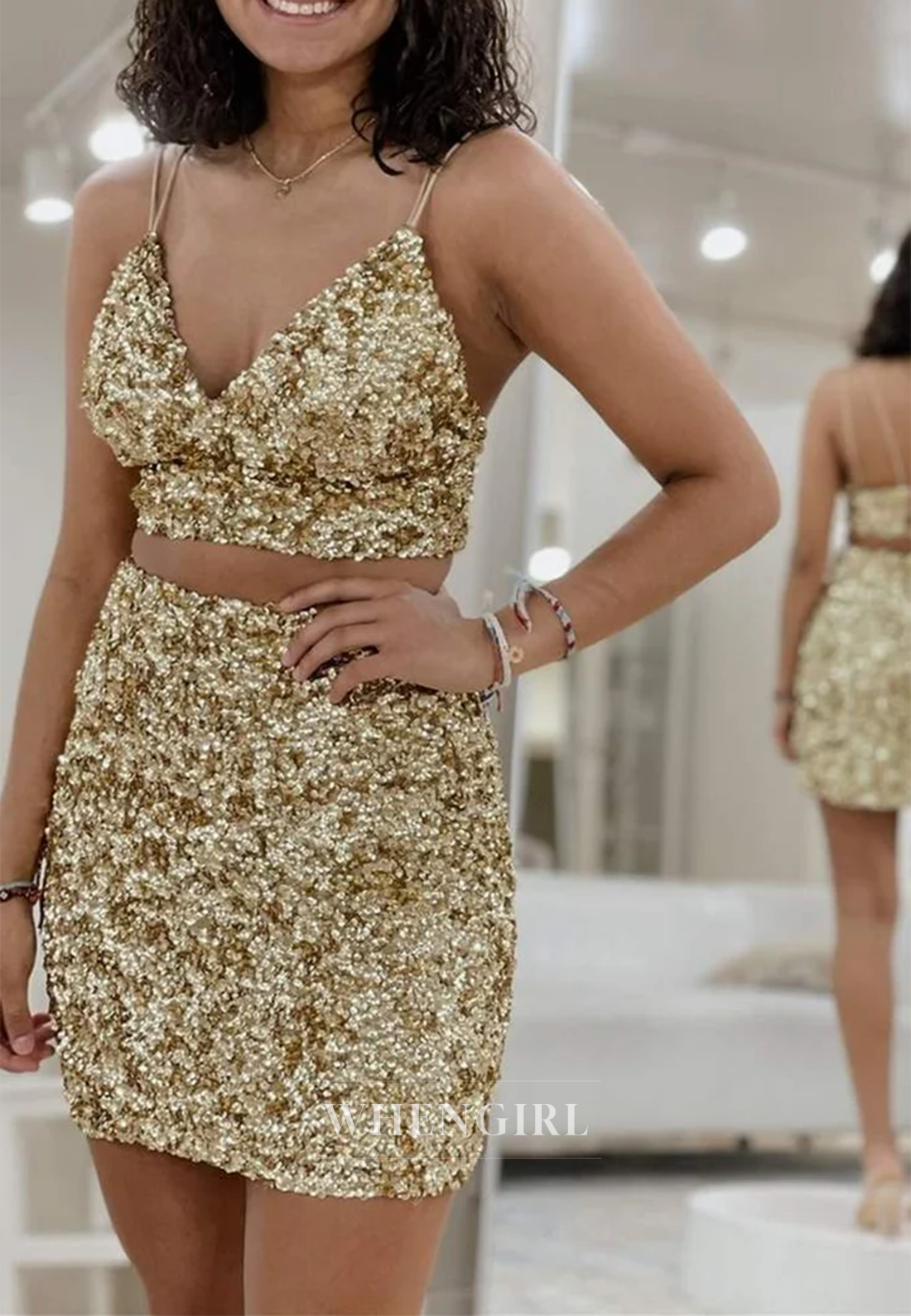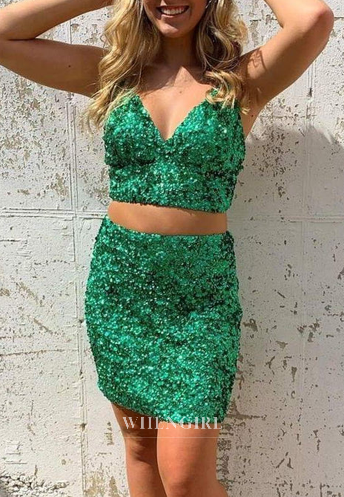 This sheath homecoming dress features a flattering V-neck and delicate spaghetti straps for a refined silhouette. Sequins embellish the fabric, adding a subtle shimmer that catches the light beautifully. The lace-up back allows for an adjustable fit, combining elegance with comfort for a confident appearance at any special event.