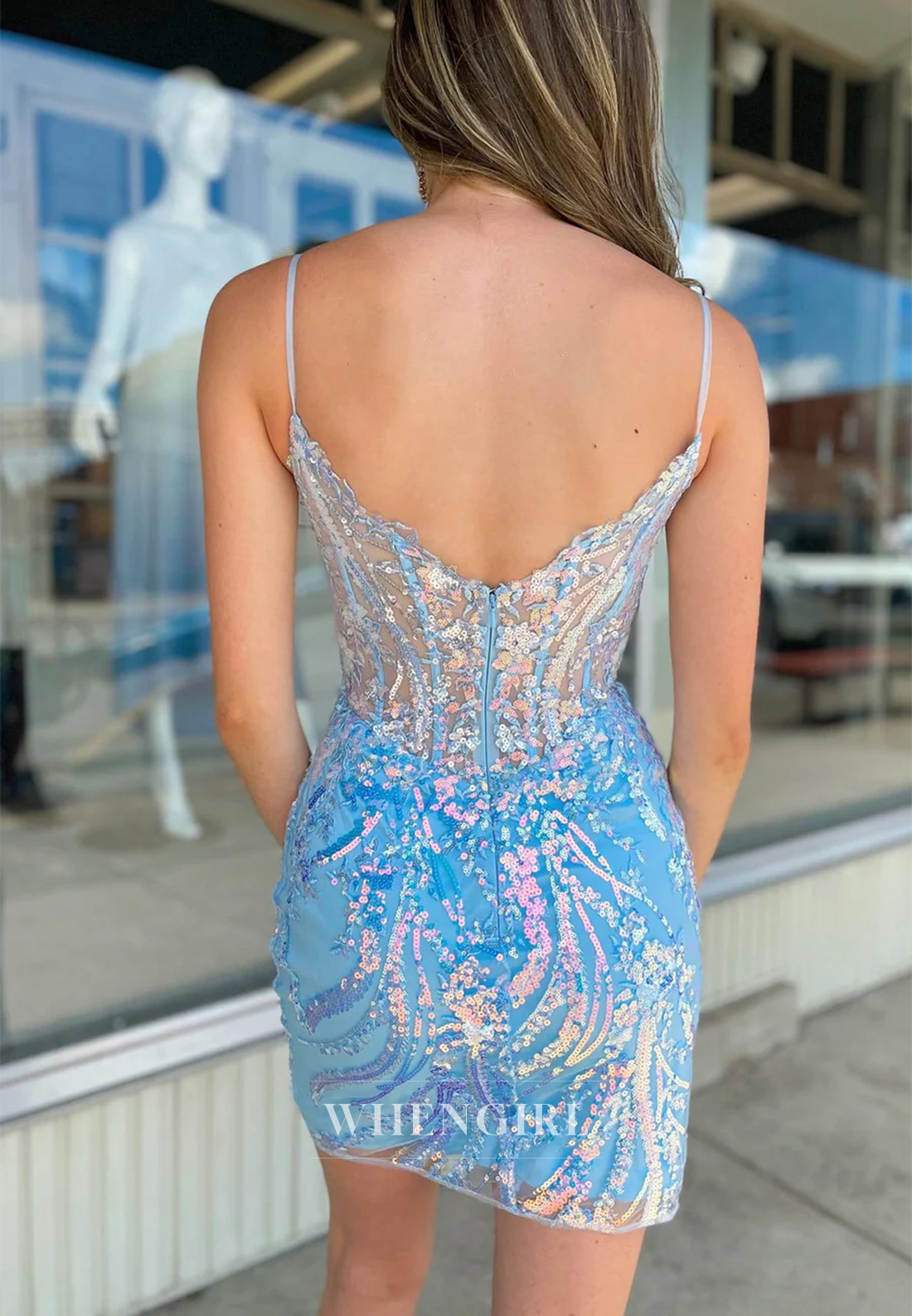Sheath Sweetheart Sequins Spaghetti Straps Sleeveless Back Zipper Homecoming Dress