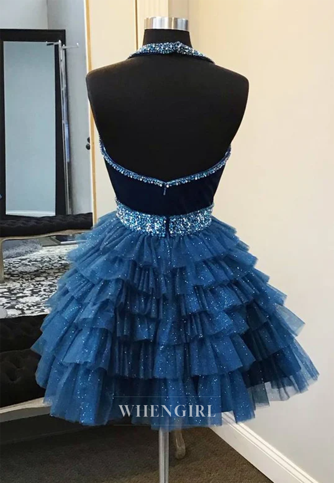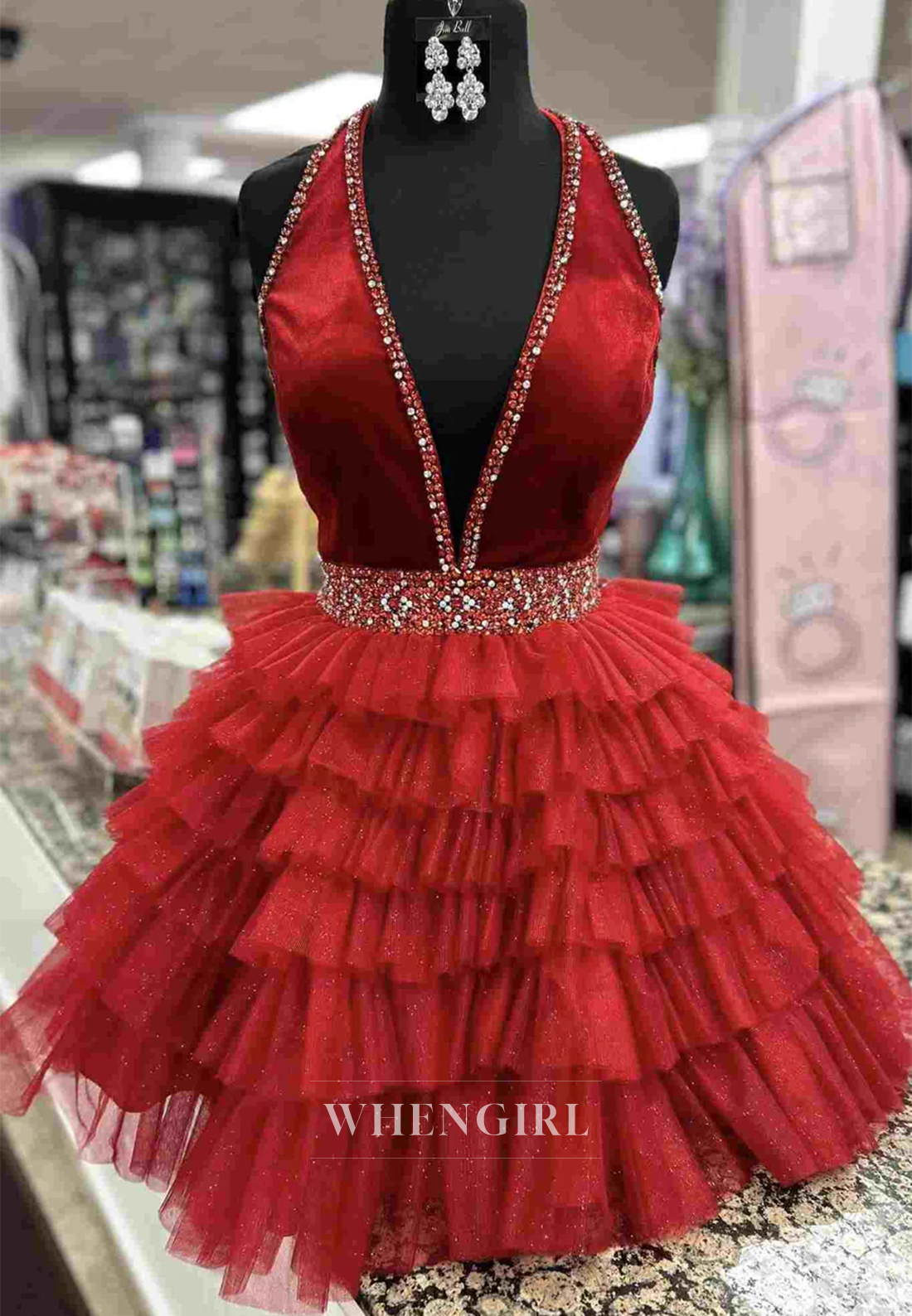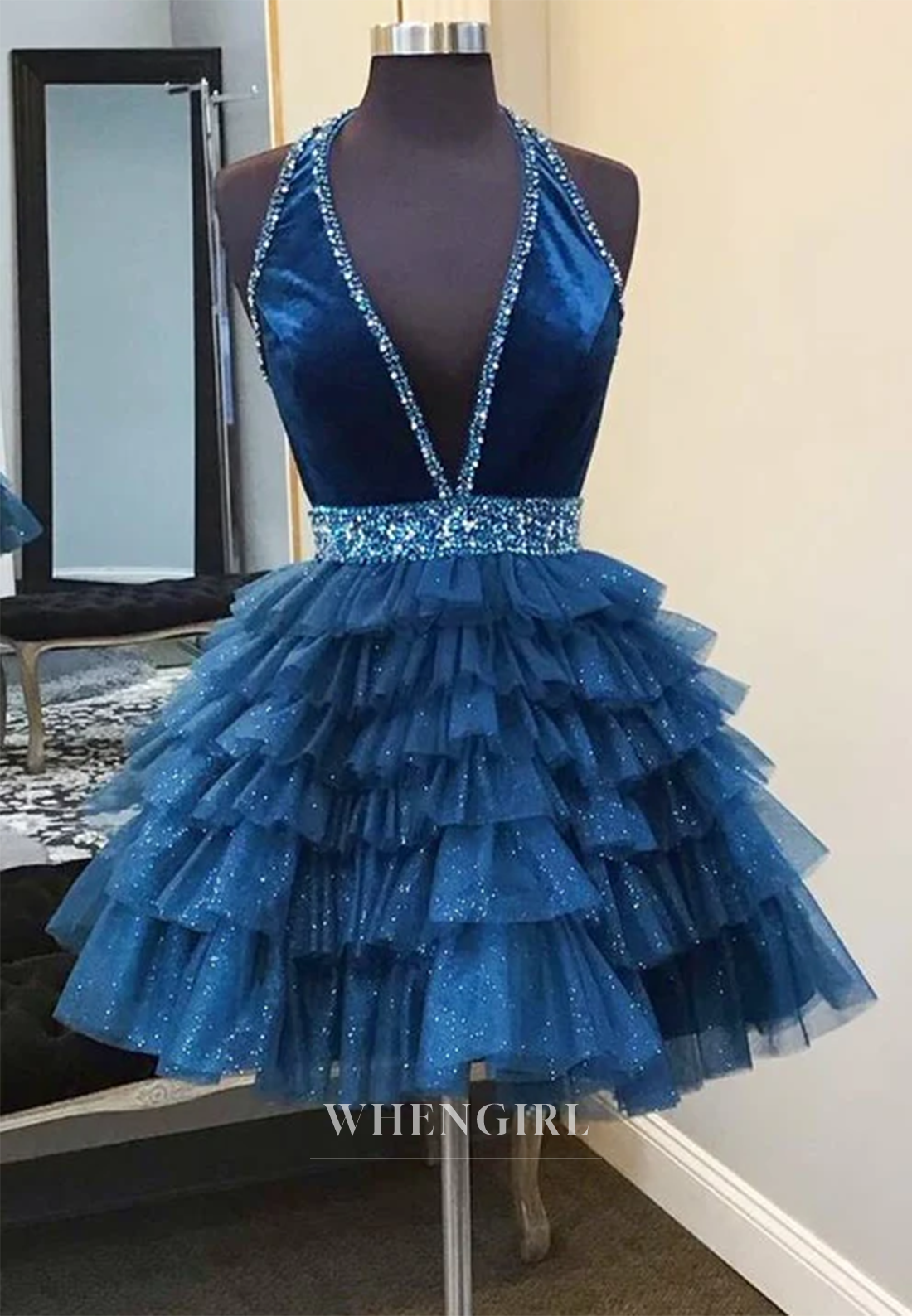 A-Line V Neck Sleeveless Halter Multi Tiered Beaded Short Homecoming Dress