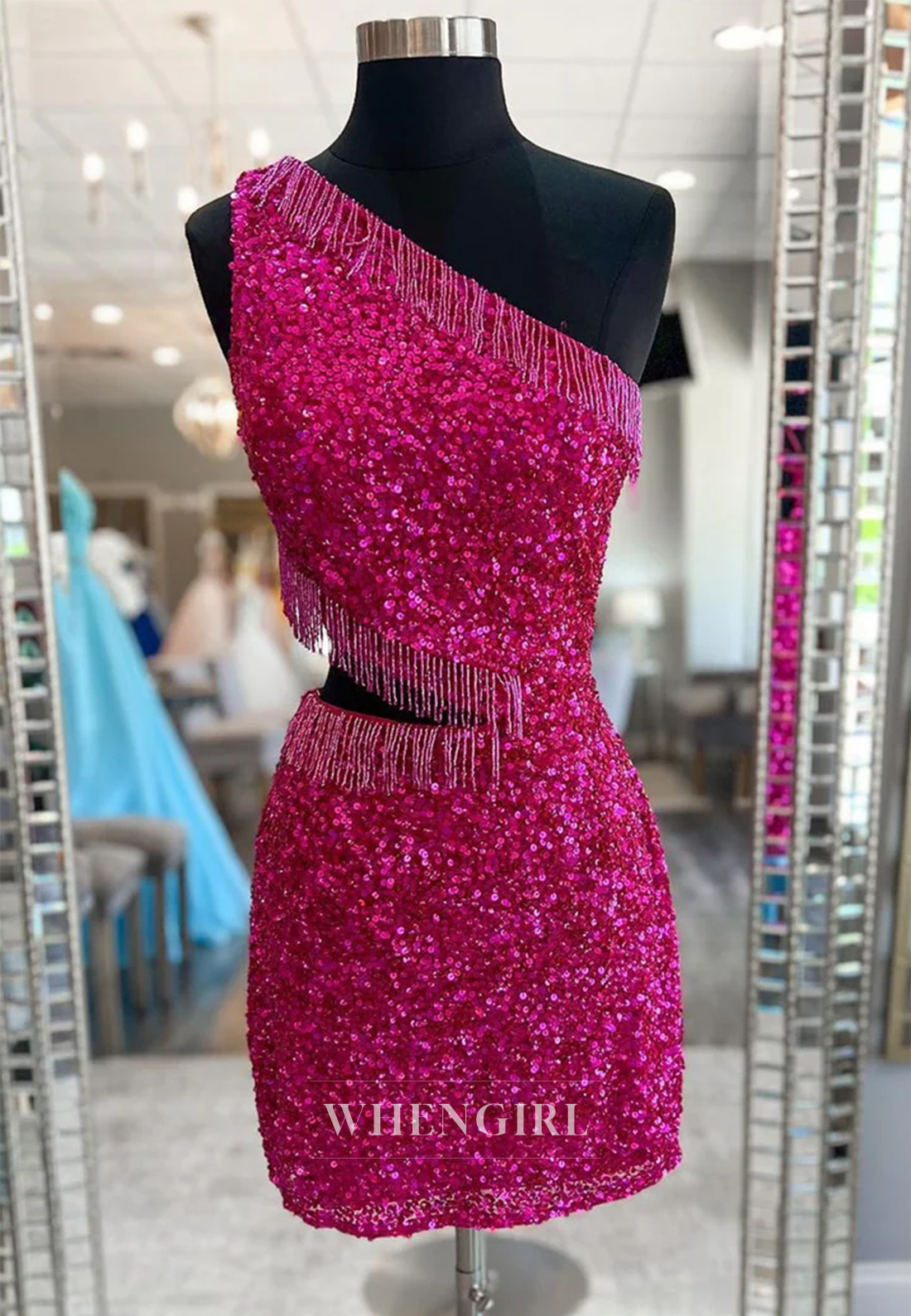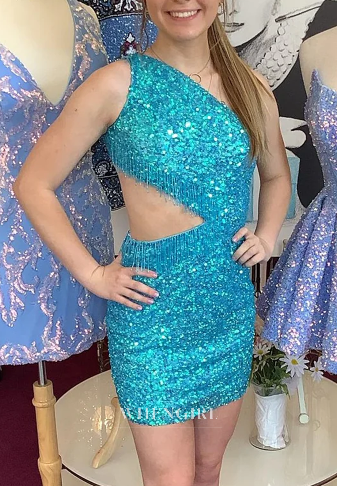 Sheath One Shoulder Cut Out Sequins Tassel Cross Back Short Homecoming Dress