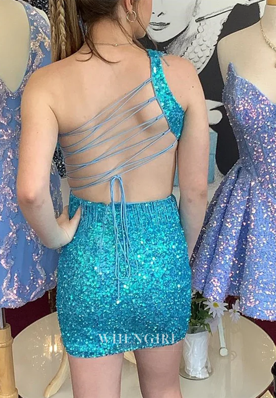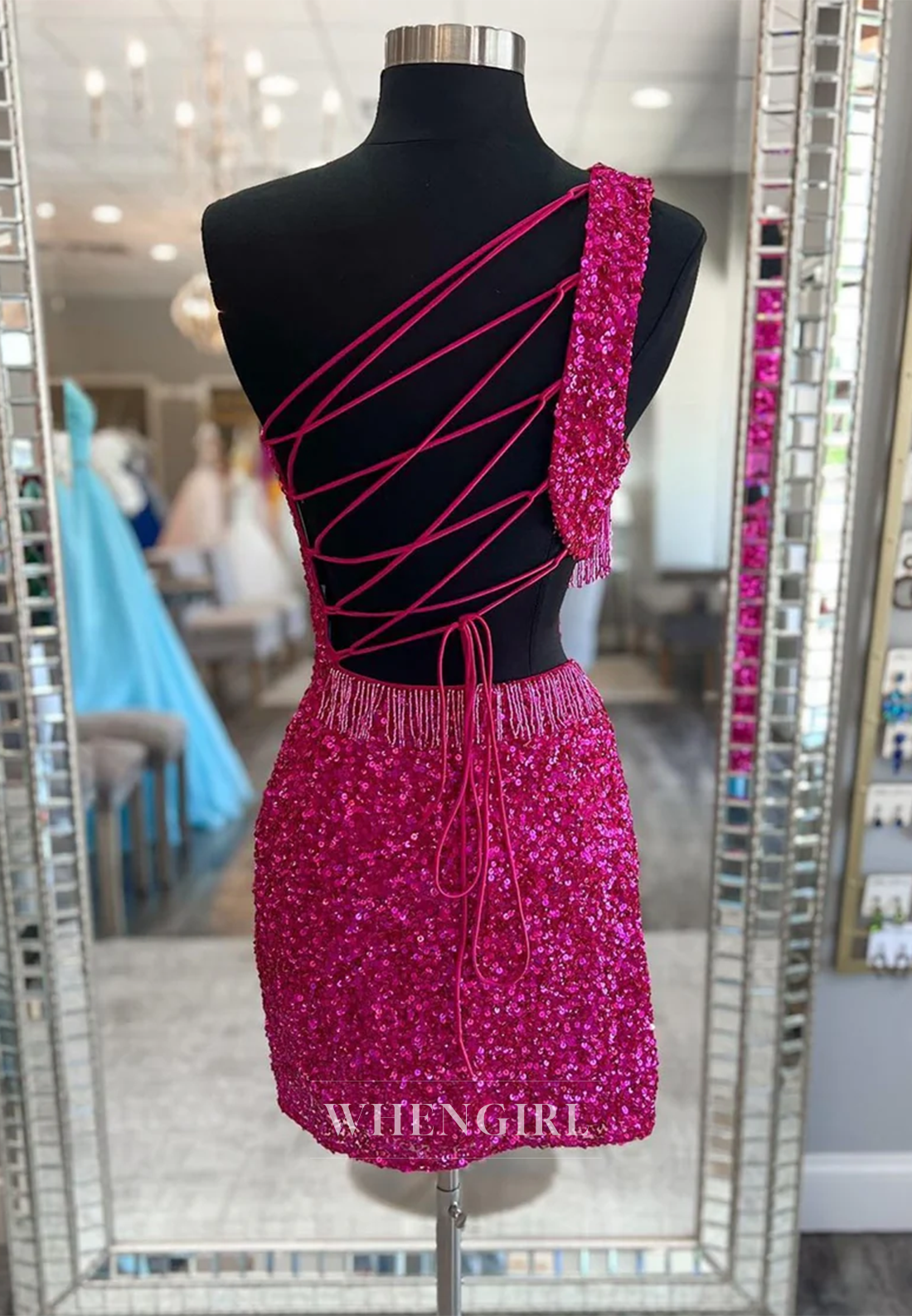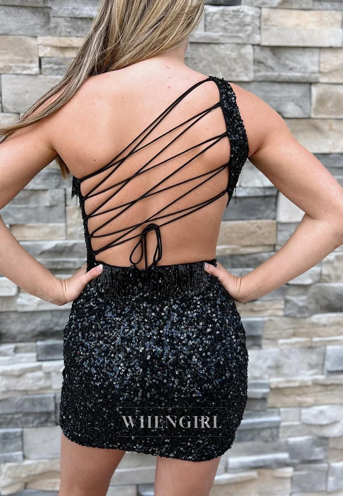 Sheath One Shoulder Cut Out Sequins Tassel Cross Back Short Homecoming Dress x 1;