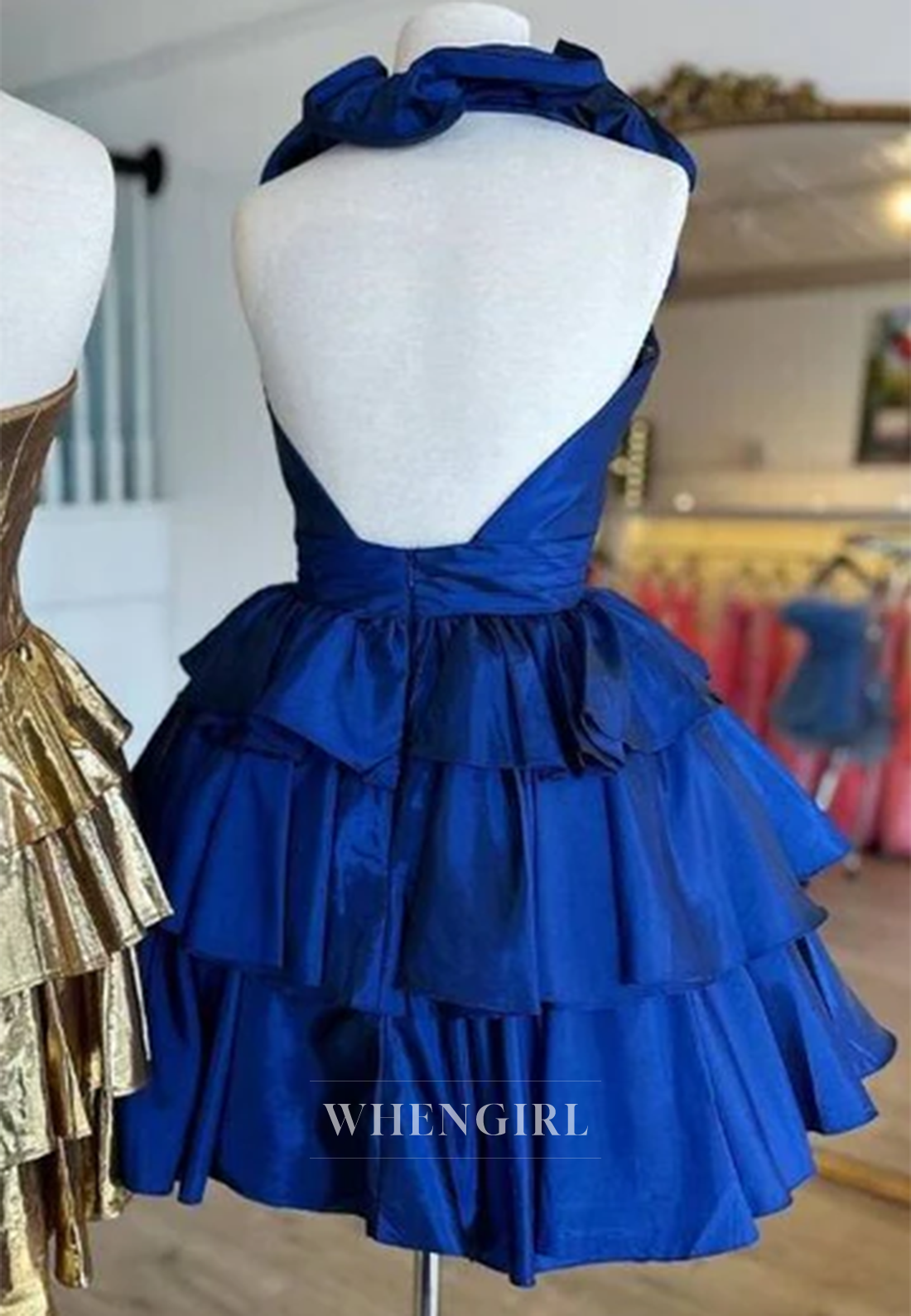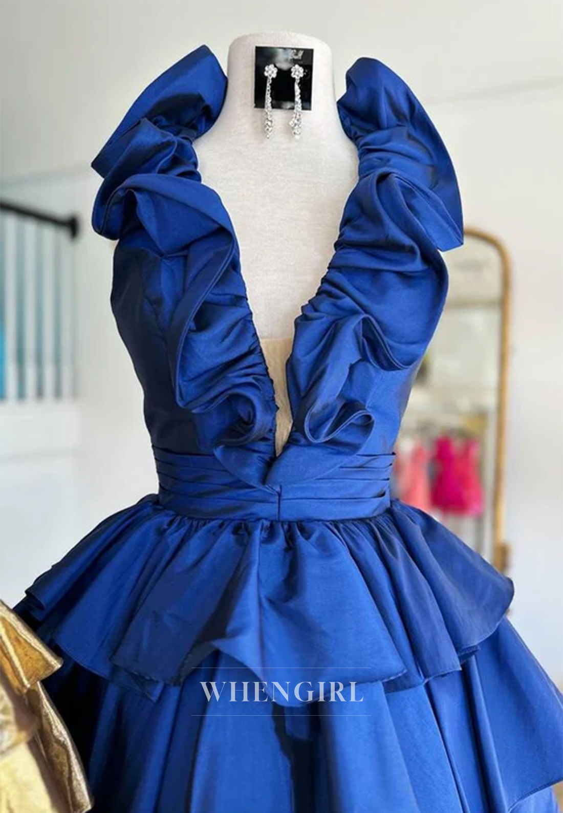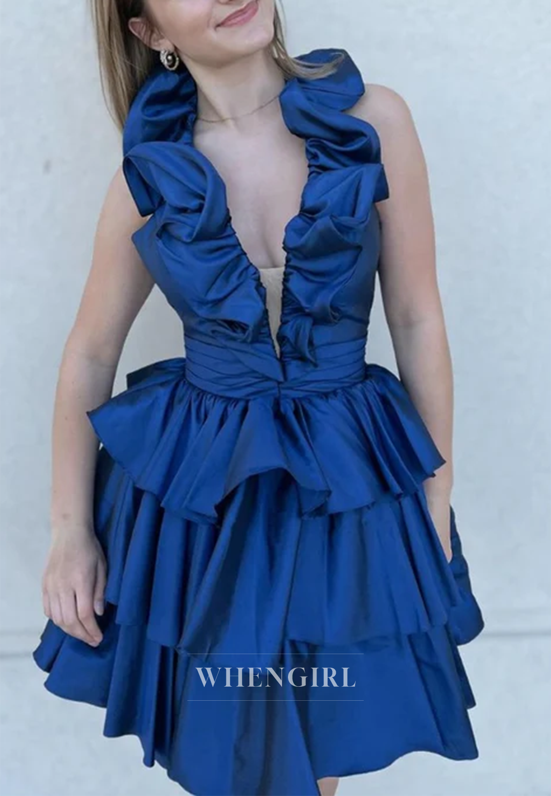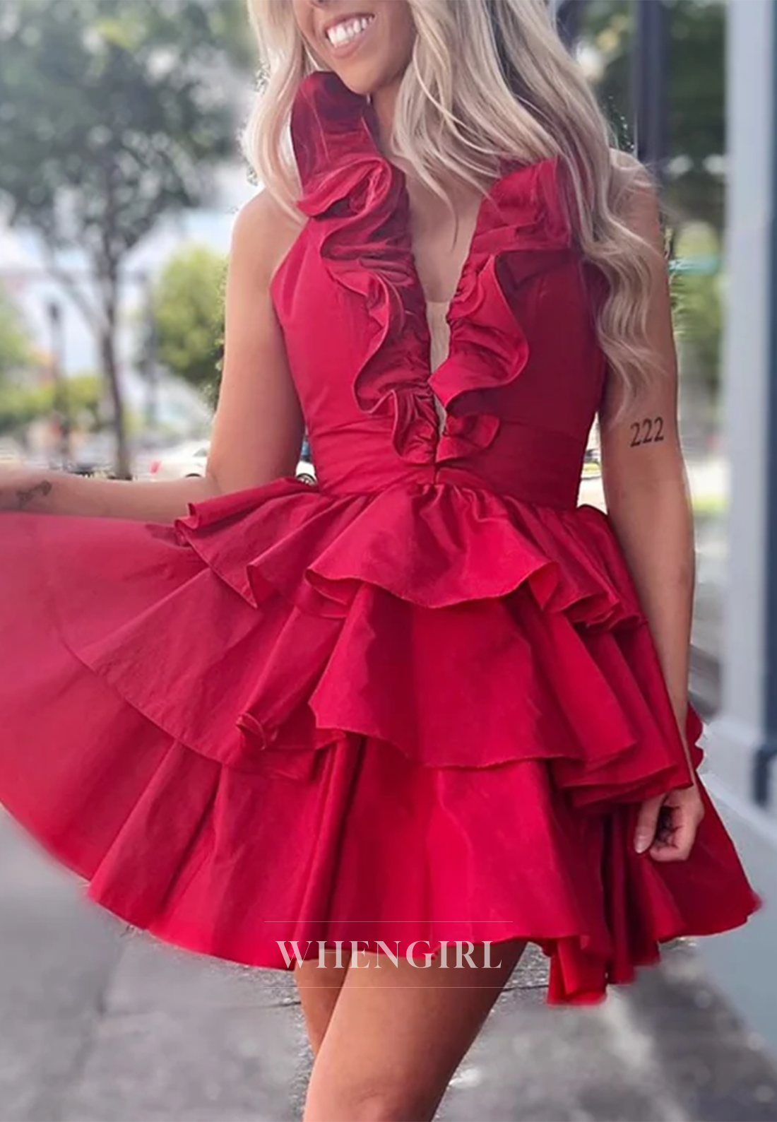 This A-line homecoming dress features a flattering V-neck and sleeveless design, offering both elegance and comfort. Its multi-tiered ruffles add dynamic texture and movement, creating a sophisticated yet playful silhouette. The short length makes it perfect for dancing and socializing, ensuring you stand out with effortless style at any event.