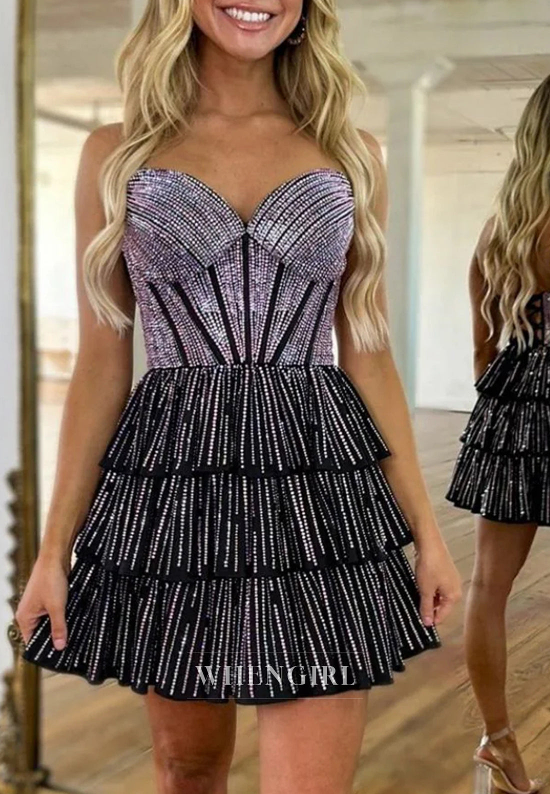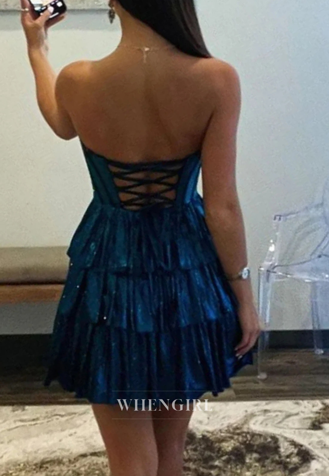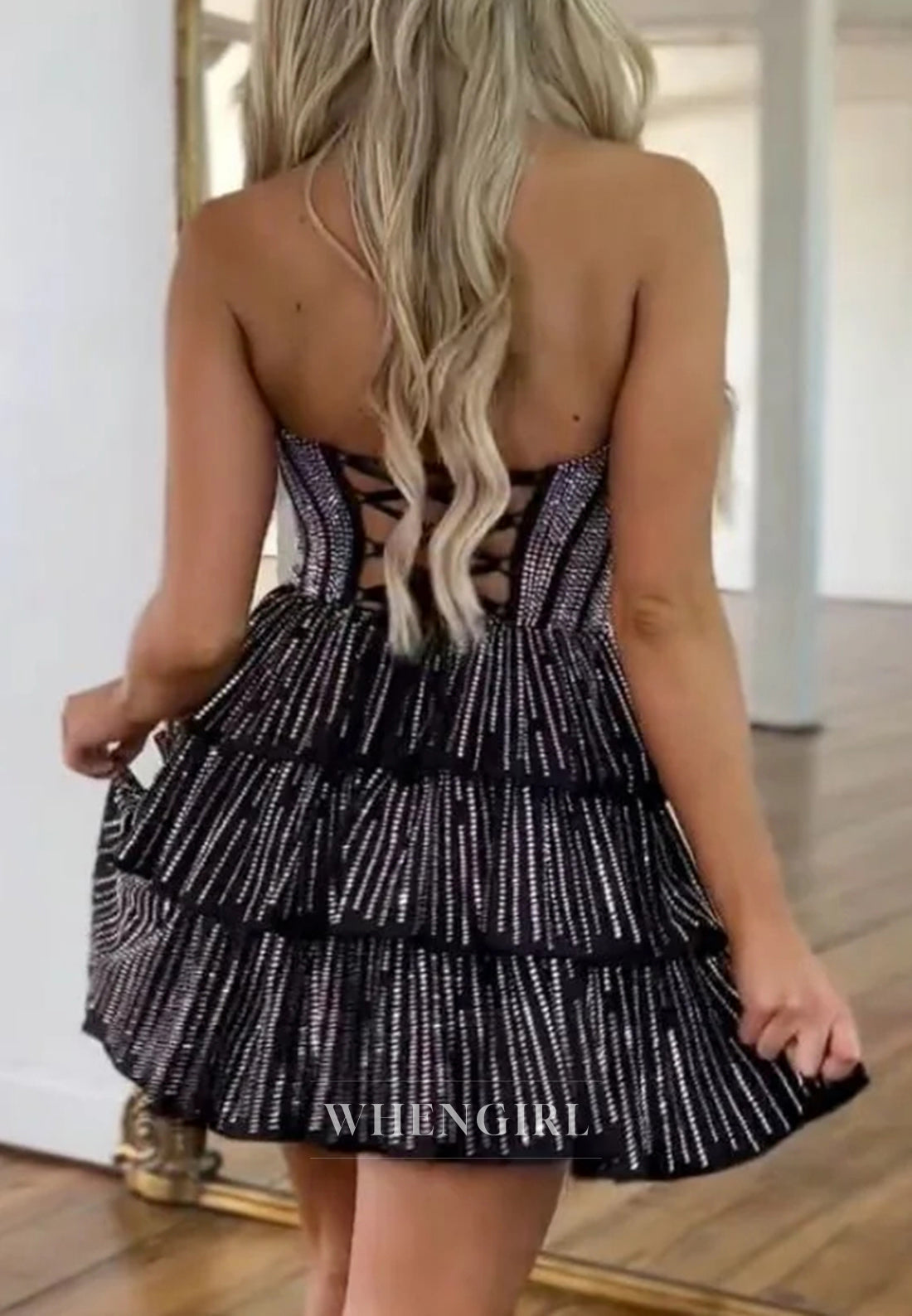 This sleeveless A-line homecoming dress showcases multi-tiered ruffles adorned with delicate beading, creating a textured and elegant look. The lace-up back allows for an adjustable fit, enhancing comfort and silhouette. Its short length offers ease of movement while maintaining a sophisticated style, perfect for making a memorable impression at any special occasion.
