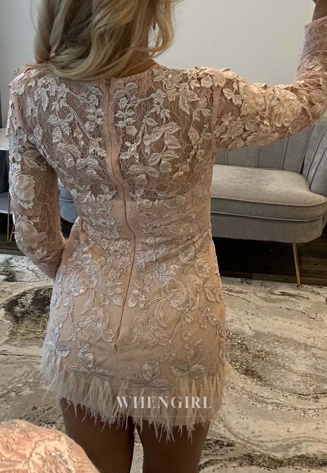 This blush lace sheath dress combines elegance and charm with its long sleeves and bateau neckline. The delicate lace fabric adds a romantic touch, while the feather detail on the back enhances its unique style. A back zipper ensures easy wear, and the short length makes it perfect for homecoming or special events, offering both comfort and sophistication.