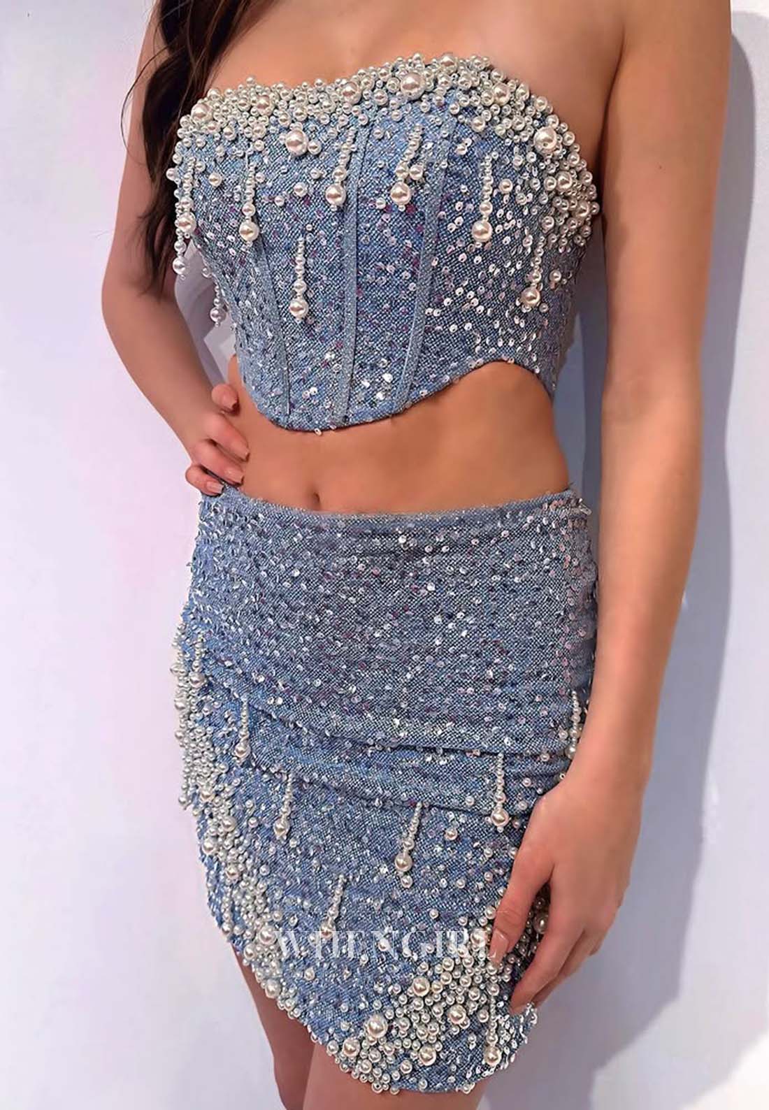 This blue tube top dress features a sleeveless design embellished with elegant pearls and playful tassels. Its short length offers a chic and comfortable fit, perfect for making a confident and stylish impression at your homecoming event. Enjoy a blend of sophistication and fun throughout the night.