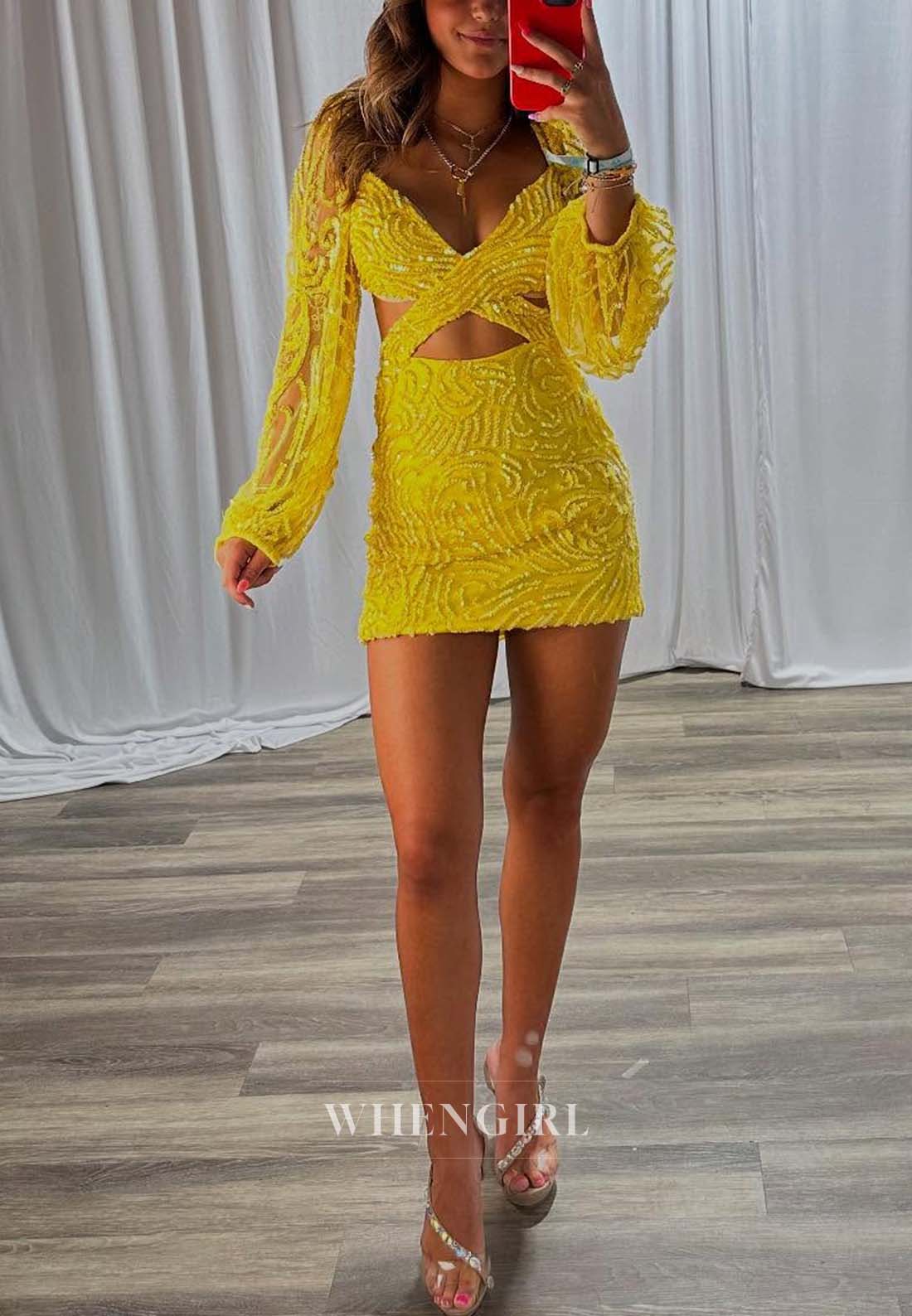 V Neck Long Sleeves Cut Out Beaded Short Sheath Homecoming Dress