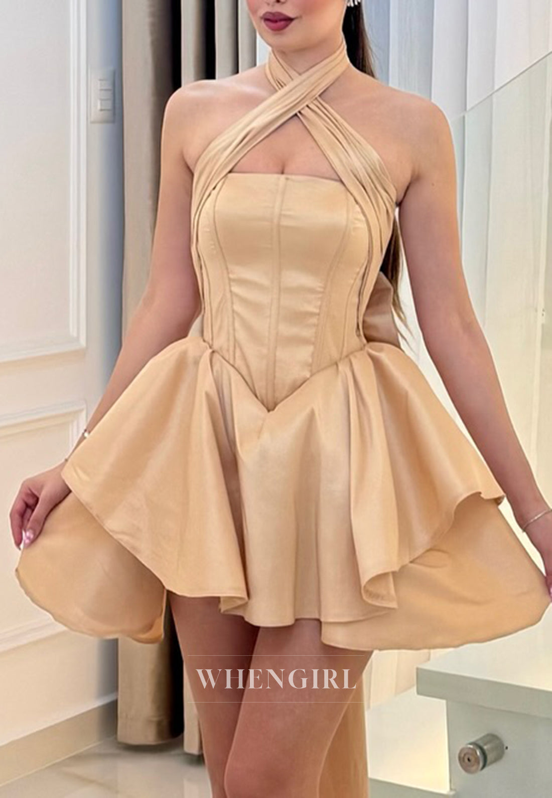 This Yellow Cross Neck Homecoming Dress features a sleeveless design with a charming bowknot and lace-up detail that adds a touch of elegance. The A-line silhouette offers a flattering fit that moves gracefully with you. Its bright yellow color brings a cheerful and radiant vibe, helping you feel confident and beautiful at your special event.