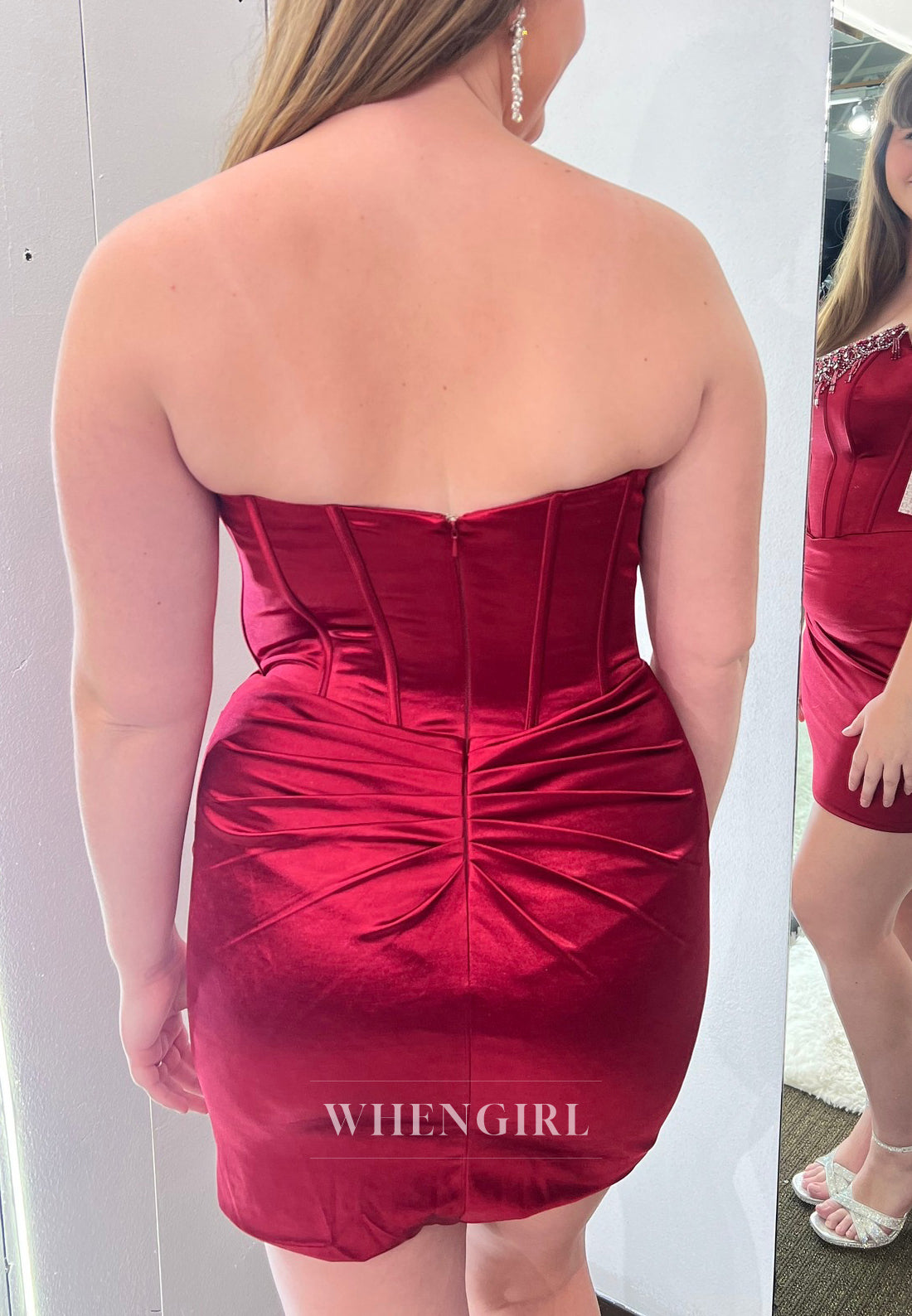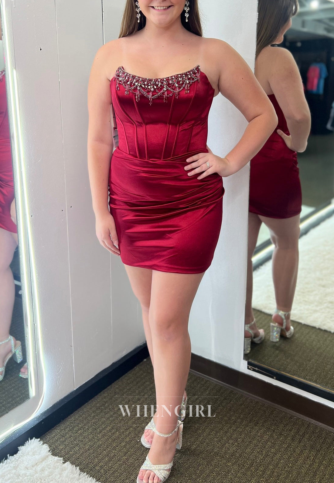 Burgundy Bateau Neck Sleeveless Beaded Pleated Sheath Back Zipper Short Homecoming Dress