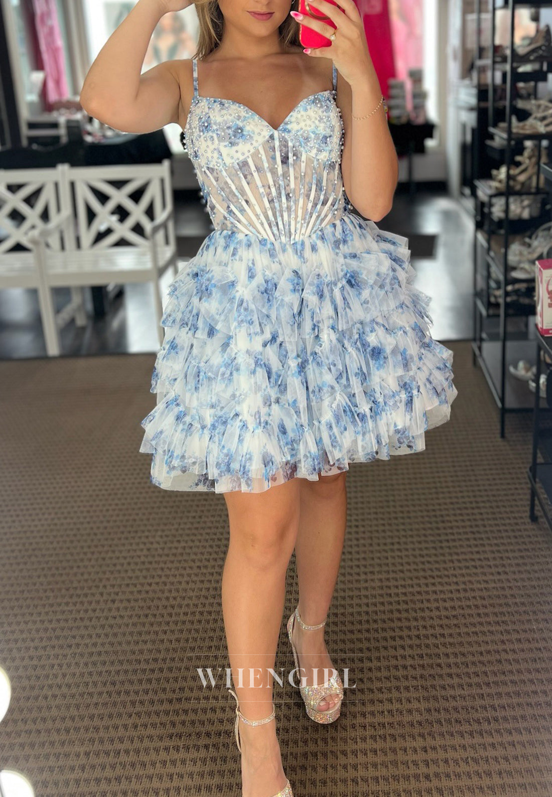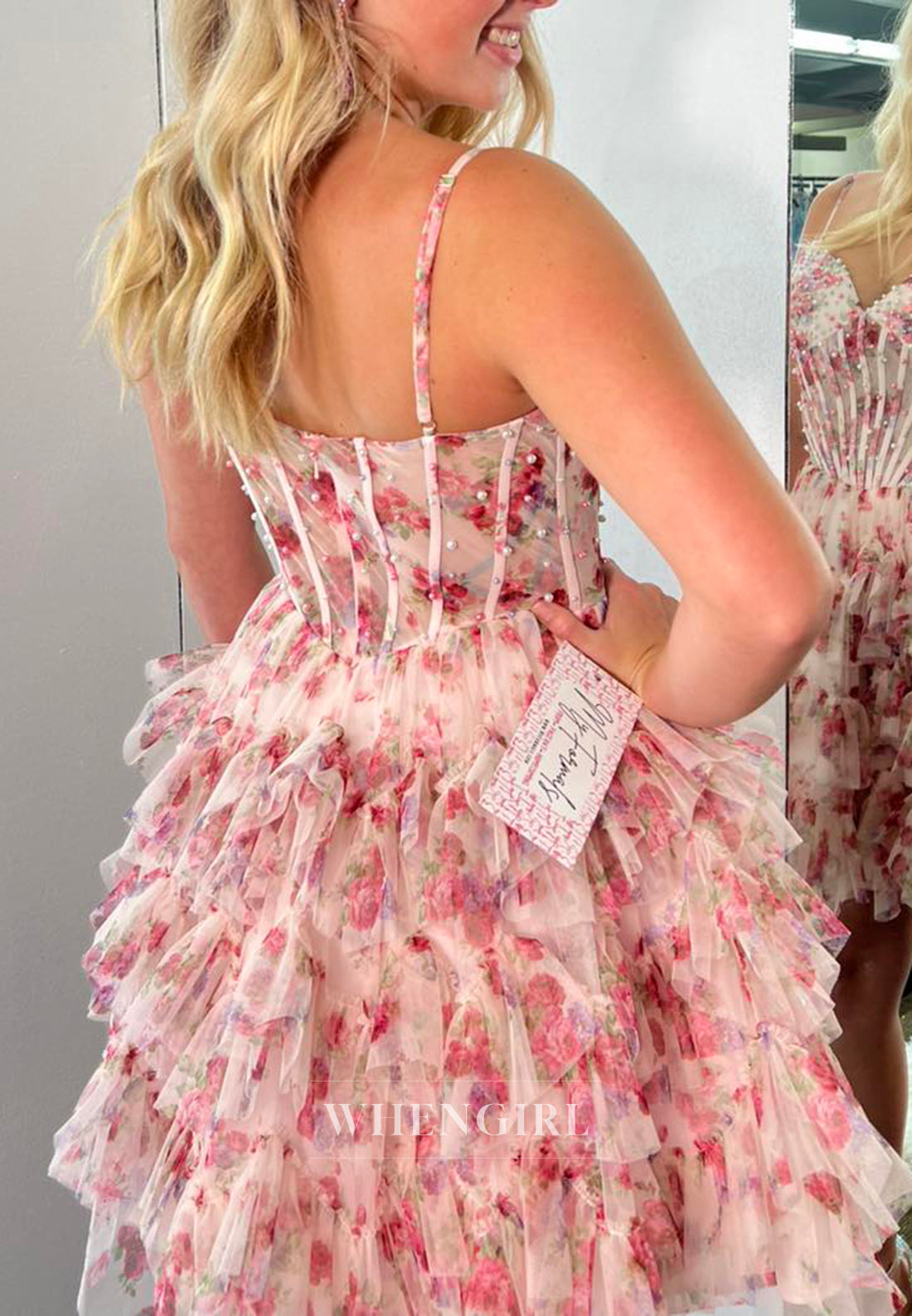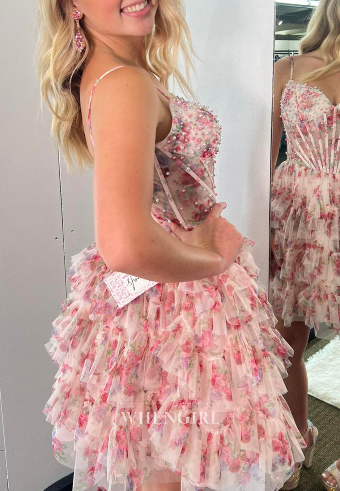 V Neck Pearls Beaded Multi Tiered Floral A-Line Back Zipper Short Homecoming Dress