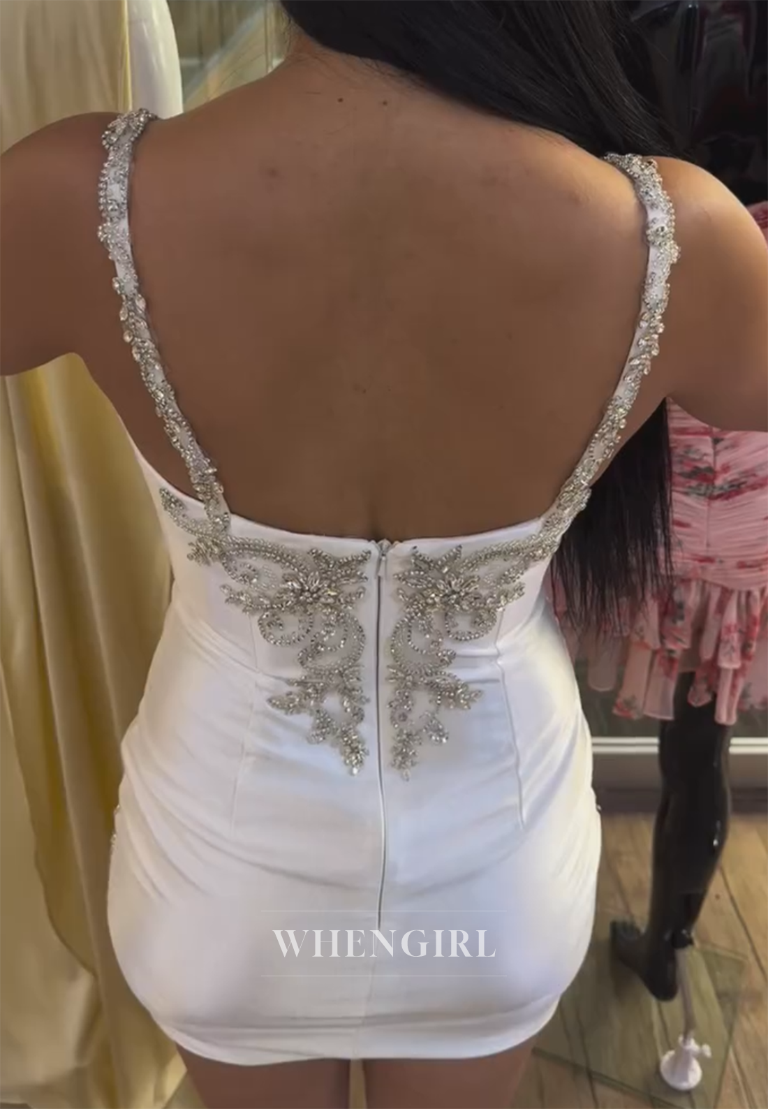 This White sheath dress features a flattering V-neckline and sleeveless design with delicate beaded straps, adding a touch of elegance. The pleated skirt enhances movement and style, while the back zipper ensures a comfortable, secure fit. Perfect for helping you feel confident and radiant at your homecoming event.