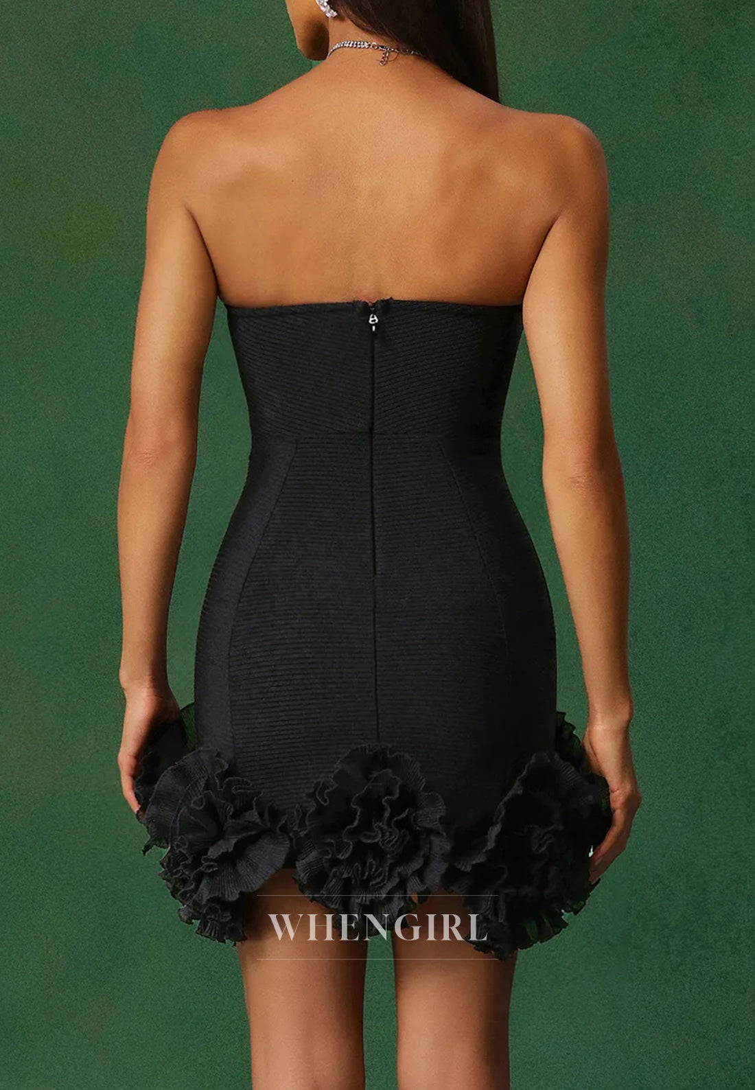 This black sheath mini dress exudes sophistication with its strapless, sleeveless design adorned with subtle floral accents. The back zipper offers a seamless fit, highlighting your silhouette with elegance. Perfect for homecoming or formal events, this dress combines classic style with modern detail to ensure you make a graceful and memorable impression.