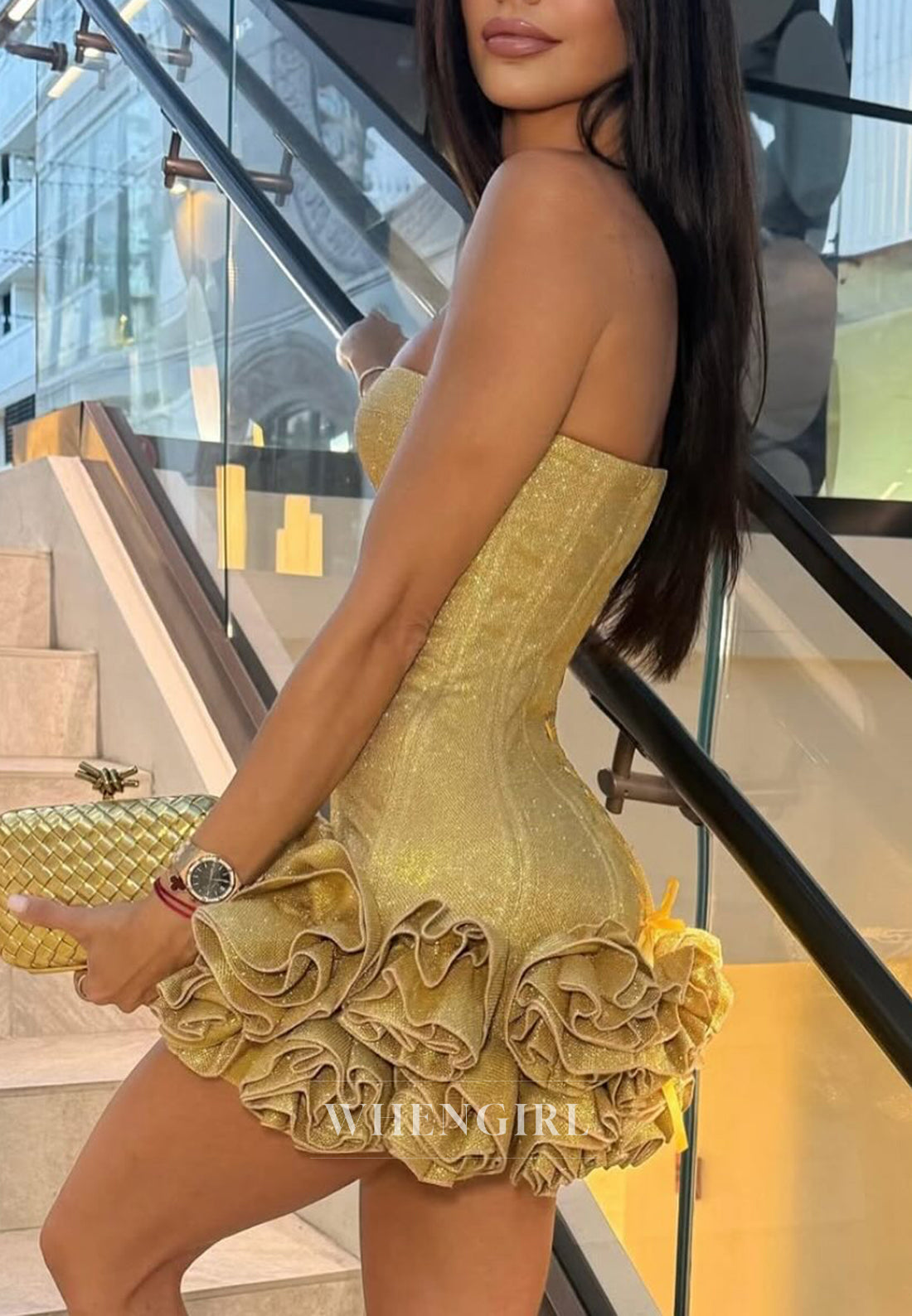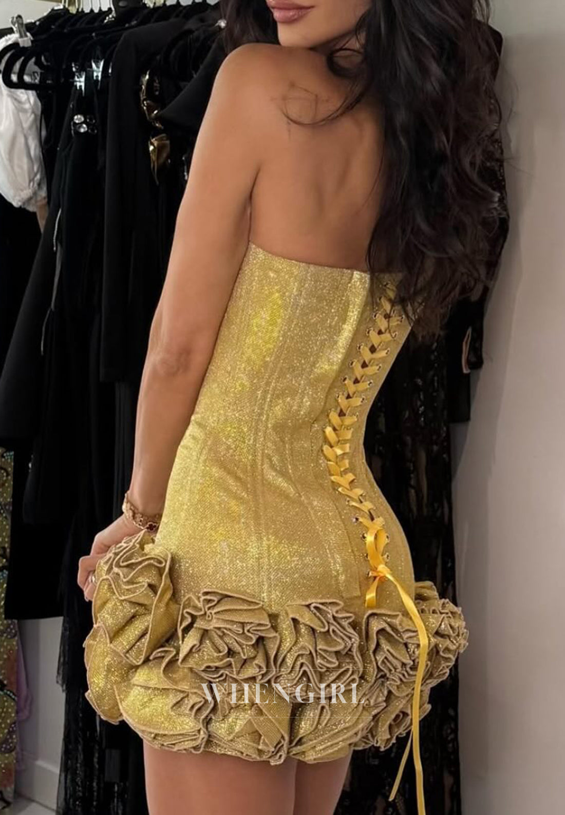 This sleeveless tube top homecoming dress features intricate 3D floral appliqués and a delicate lace-up back, creating an elegant and feminine silhouette. The short sheath design offers a flattering fit that highlights your figure while keeping the look refined and sophisticated for any special occasion.
