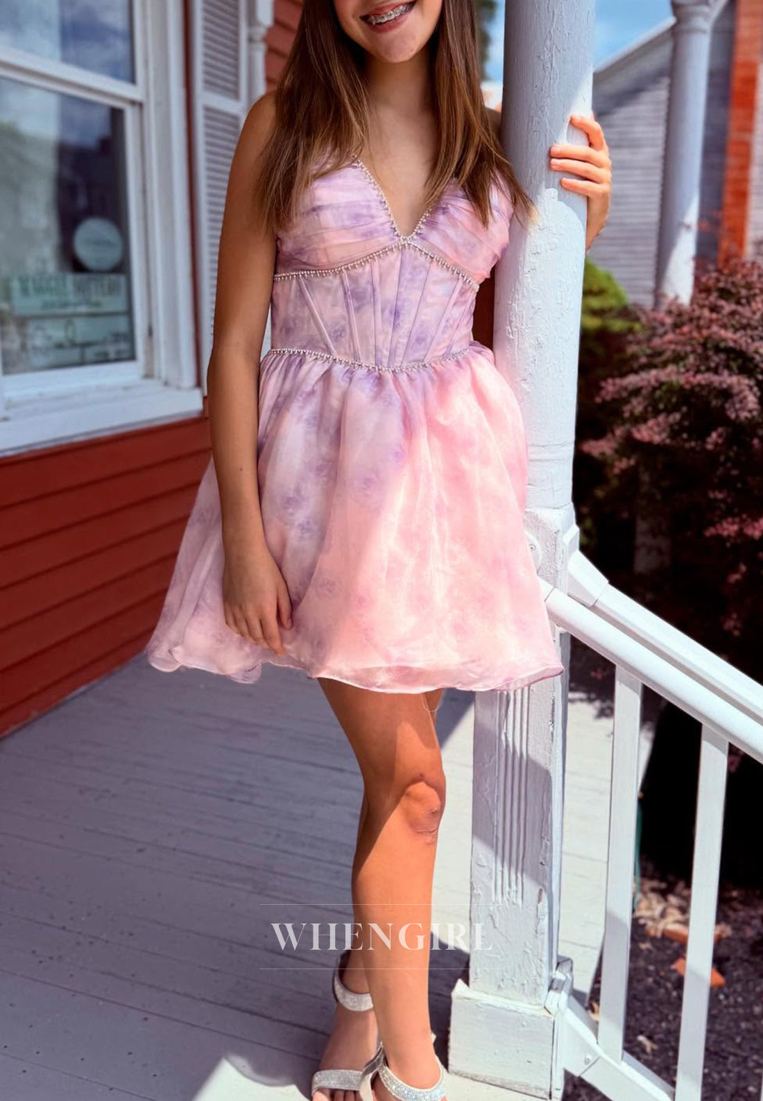 A-Line Printed Flowers V Neck Beaded Short Homecoming Dress x 1;